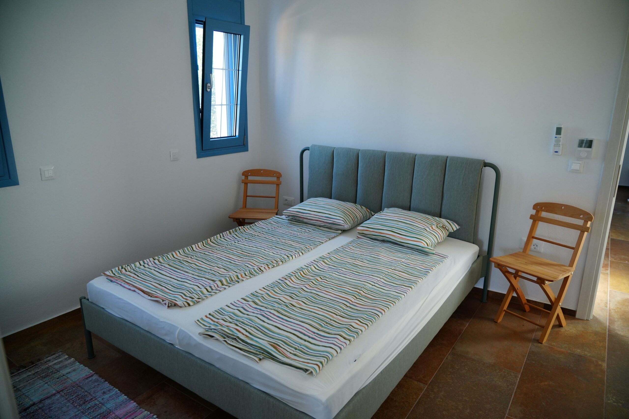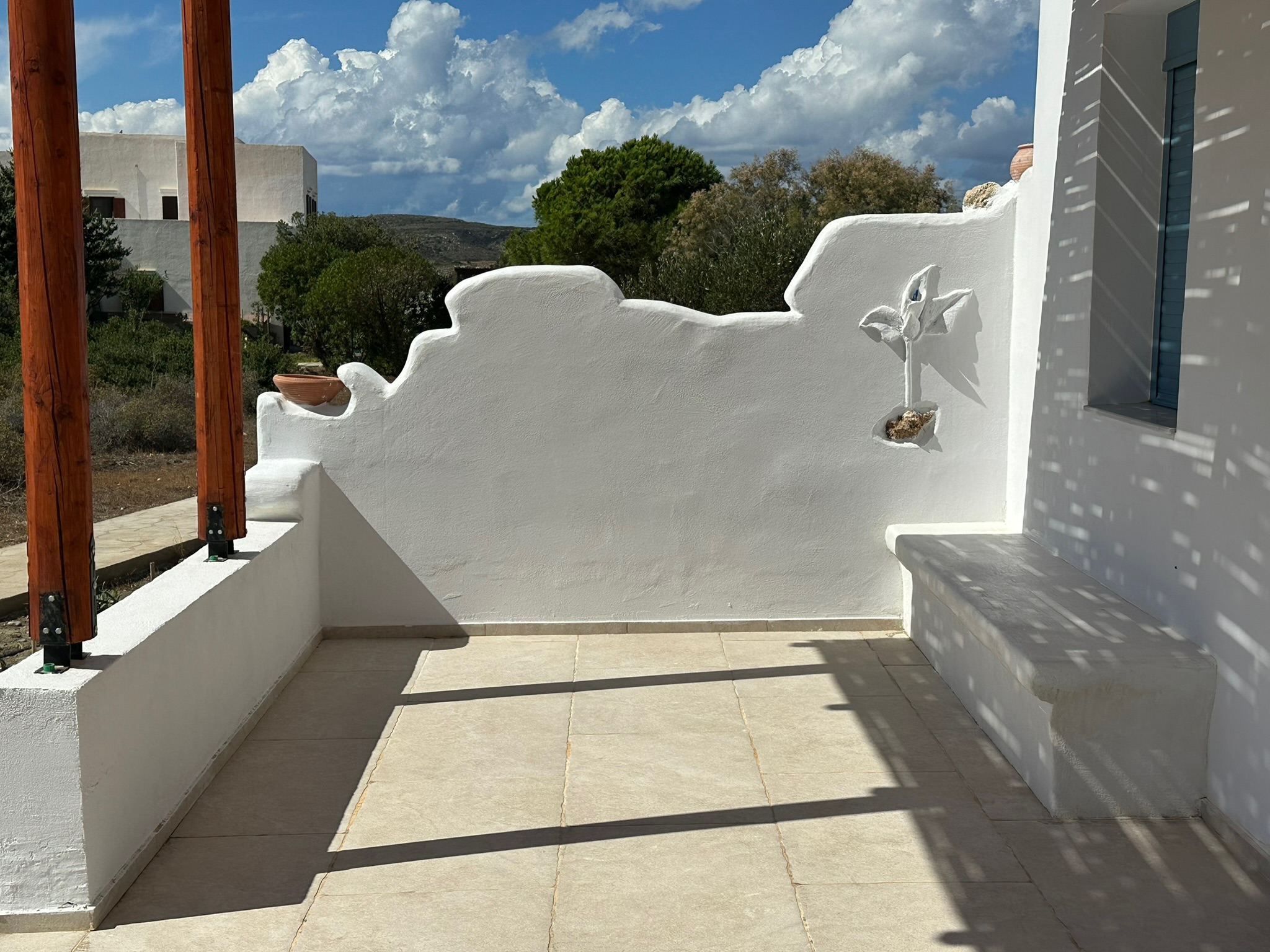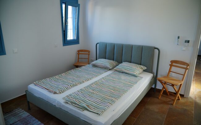 Both apartments reflect the timeless character of Greek architecture and were planned and designed with great attention to detail by the owners. Each apartment features a spacious living/kitchen area, two separate bedrooms, and a high-quality bathroom, accommodating up to six people. Each apartment also has a private terrace. The generous atrium, with its various separate seating areas and a beautiful olive